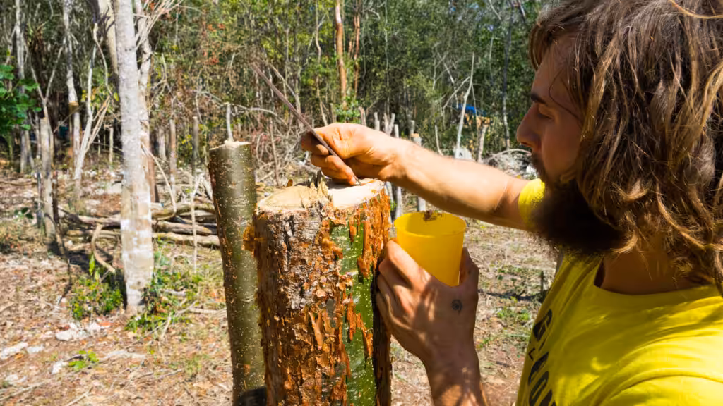 Die Holzkohle wird mit Kokosnussschalen klein gerieben, zu Pulver. Das Harz kommt aus den nachwachsenden Bäumen. Das riecht gut und wird für anderes genutzt. Dazu mischt er noch den „Puder“ einer Rinde, das es nicht zu klebrig ist und Mischt die Sachen zusammen. Dazu kann man es mit Messer drücken oder je nachdem was zur Verfügung steht. Das es wirklich kompakt zusammengedrückt und gemixt ist.