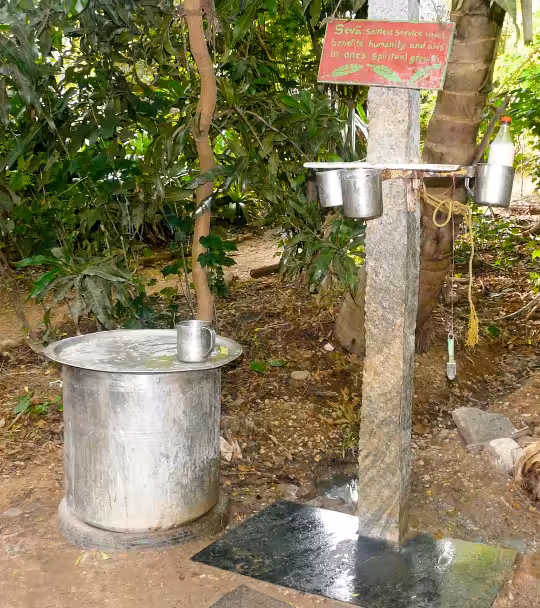 Der Spülbereich für die Teller ist hinter der Küche. Das Teller wird durch die Wasserbehälter, in Etappen gereinigt. Erst mit Fasern aus der Kokosnuss und Asche, dann ohne Asche und Klarspülen. Es bleibt dann im großen Behälter, bis der Küchenspüler es mit Essig desinfiziert und zum trocken aufstellt (Sonnentrocknung).