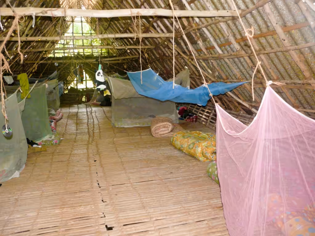 Die Häuser sind alle aus Bambus und Schnüren, da die Grasdächer nicht so lange halten, haben sie hier „normalere“ Dächer. Die Häuser werden regelmäßig nach Tieren (Termiten, Wespen) abgesucht und früh umgesiedelt, so das kein Problem entstehen kann.