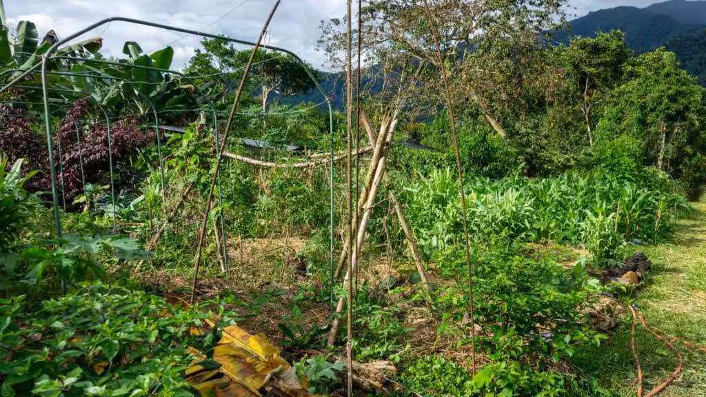 Der Garten ist riesig, und es gibt viel zu tun, sehr abwechslungsreich. Z. B. mit der Machete die Fruchtbäume befreien, die Bananen pflegen, Pflanzen, Pflanzenschule usw. Autark sind sie hier noch nicht, arbeiten aber schwer daran. Viele Fruchtbäume werden gepflanzt und jetzt schon, je nach Saison viel geerntet. Jackfrucht, Moreng, Chanta, Flügel-Bohnen, Eiscreme-Bohnen, Bananen (viele Sorten), Chaiote usw.