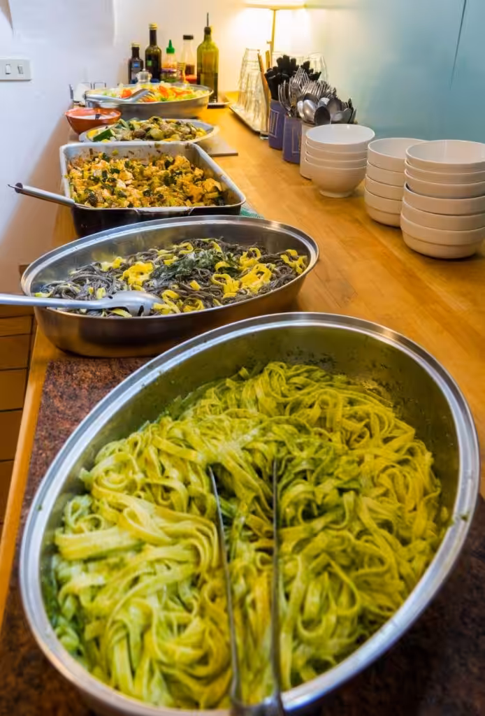 Die kochen oft Italienisch, also Pasta, Brot und Olivenöl. Es ist sehr lecker, etwas „schwer“ wenn man nicht dran gewöhnt ist. 🙂 Als Helfer kann man in der Küche mitmachen, die professionell ausgestattet ist. Es gibt meist vegetarisches, auch glutenfreies Brot, wenn die wissen, dass es jemand möchte.