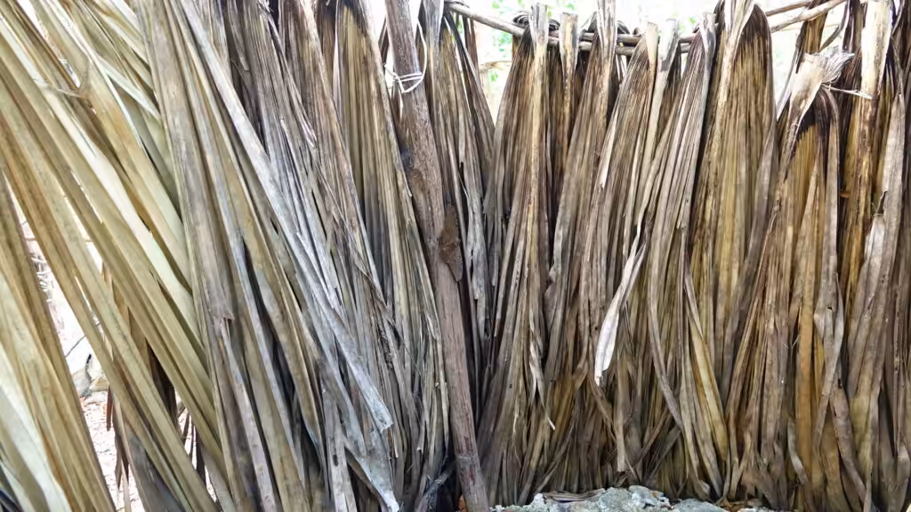 Sieht aus wie Bushcrafting, einfache und natürliche Dinge werden für die Dusche verwendet. Die Palmblätter als Sichtschutz ist gut. Es dürfen nur ökologische Seifen benutzt werden, da das Abwasser zu den Bananen fliest. Der Schlauch für direkt von einem Behälter zur Dusche. Jetzt erst neu dran sind die Plastikflaschen mit Löcher, das verringert den Wasserverbrauch.
