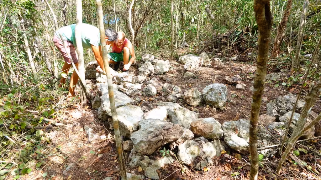Auch wie der Garten genutzt wird, es ist alles im Kreislauf. An dem Tag haben wir z. B. das alte Laub und so raus aus den Steinkreisen um die Pflanzen. Dann frischen Dünger rein, gleich gewässert und wieder mit Laub so zugedeckt. Die Sonne kommt so nicht an die Erde und es trocknet nicht so aus, bis zum nächsten gießen. Das ist in der Trockenzeit jeden Abend.
